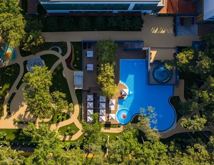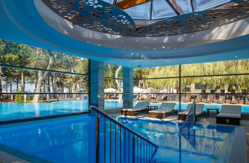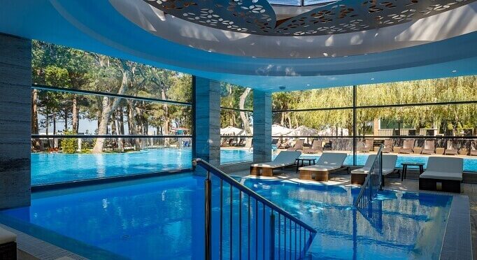 На территории отеля расположены три бассейна: один крытый спортивный бассейн на 1-этаже Wellness-центра, и два открытых бассейна: один с подогревом, работает круглогодично, второй бассейн работает сезонно с мая по октябрь.